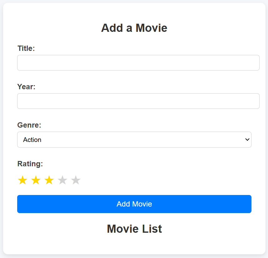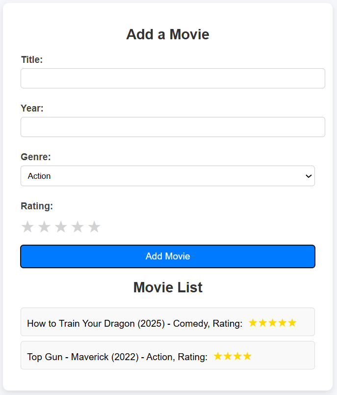 - The stars for each listed movie will just show the current rating (for now) not the average rating. We will do average rating in the update part next exercise.