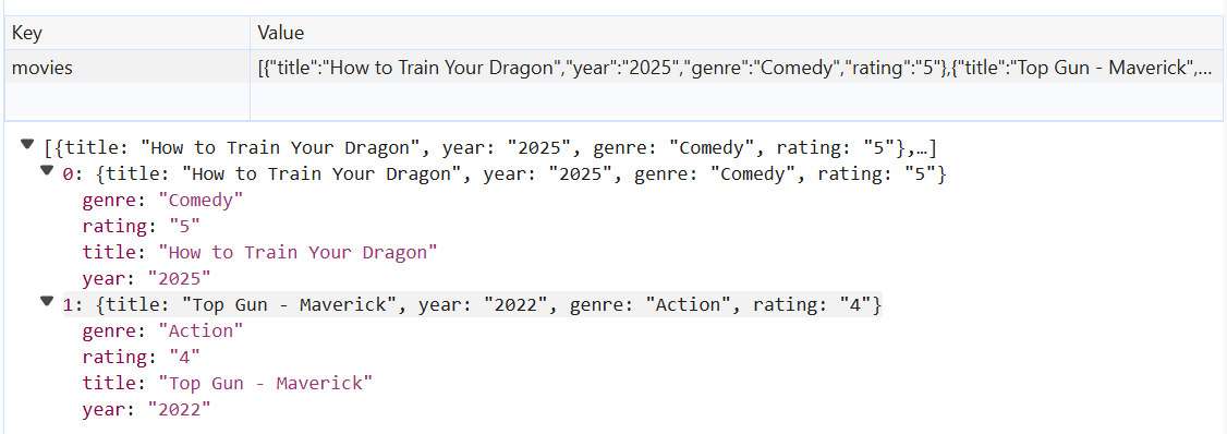 - When a user clicks the Add Movie button, it should save the data to the localStorage. Make sure that the data uses a JSObject with the correct structure but stringified. A sample localStorage status as shown below: