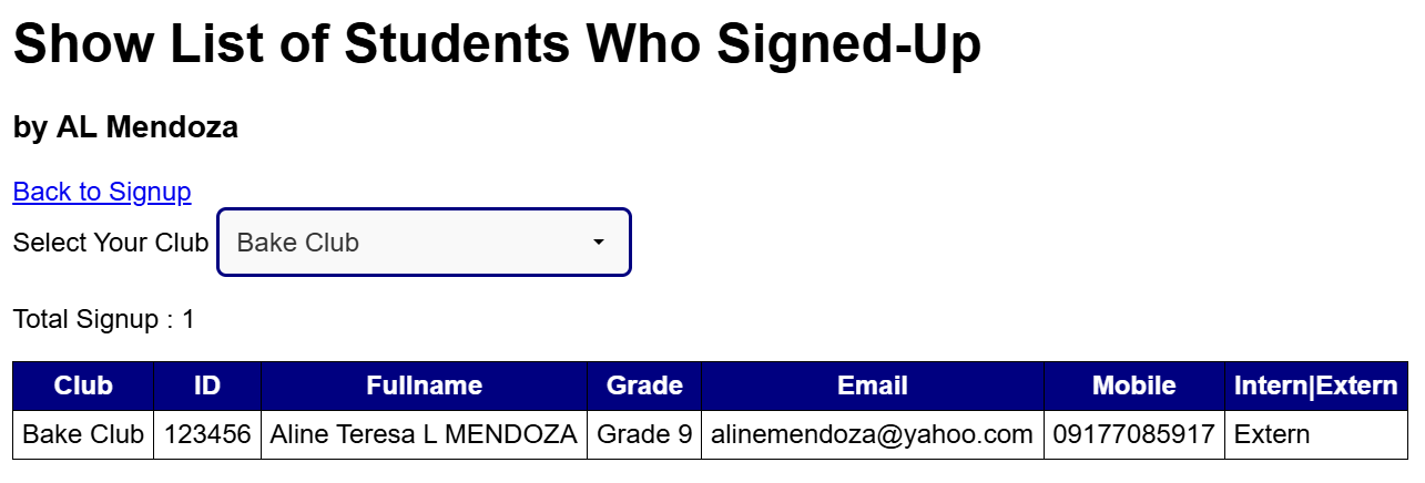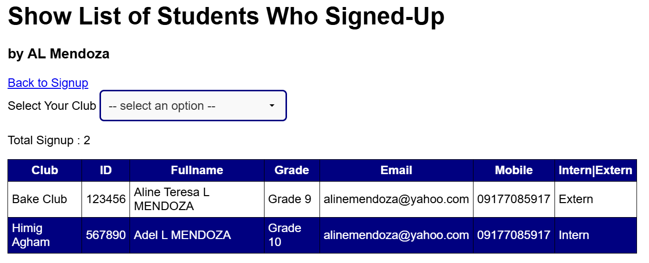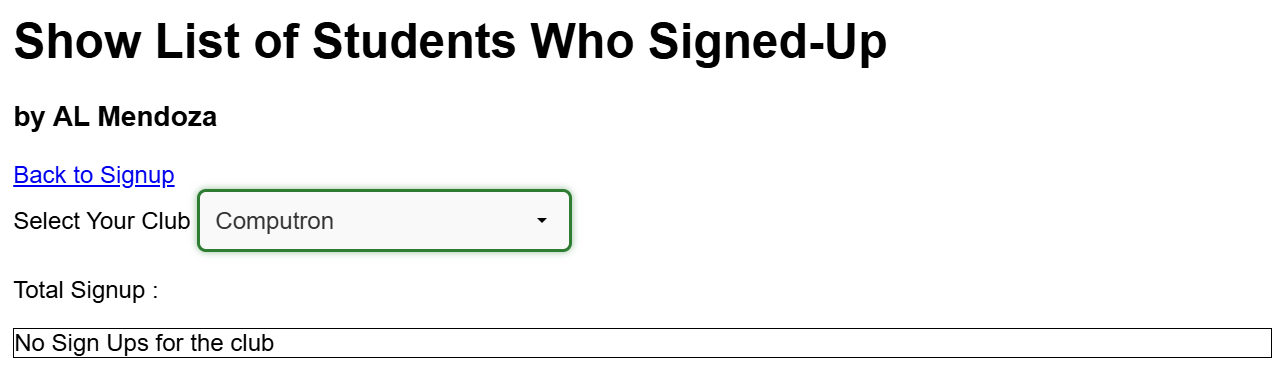 - There should be a drop-down menu for filtering the list of signups per club, initial display should be all club sign-ups of students. The list should be in a table format. A total number of sign-ups should also be displayed. See sample below: