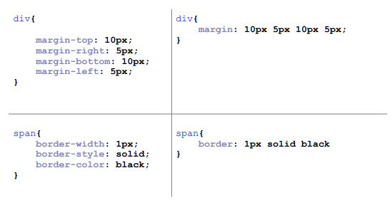 There are multiple CSS properties whose values can be declared in a single line by using the shorthand for these CSS properties. Examples include margin, border, and padding. Look at the code snippets below for an example: