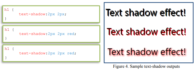 text-shadow – this property adds shadow to text. It can be used by specifying the horizontal shadow and the vertical shadow. The color and blur effect can also be added. This values are specified in order: horizontal shadow, vertical shadow, blur effect and color.